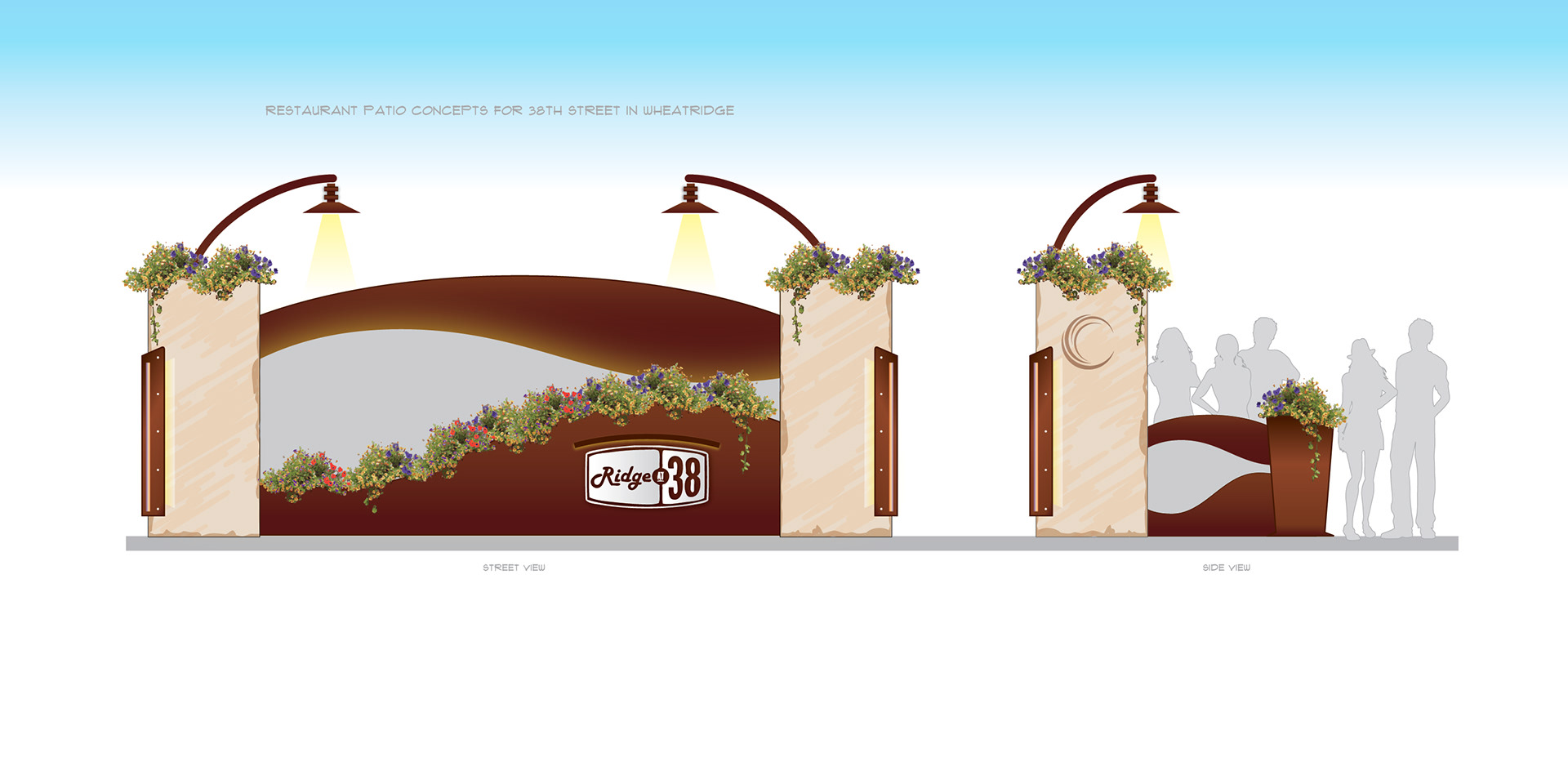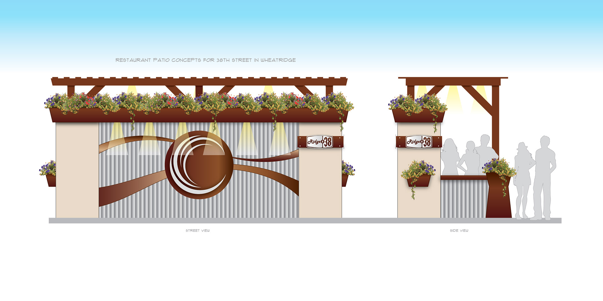 Concept for restaurants on 38th Street in Wheatridge, CO to extend into the parking spaces to accommodate more seating during Covid