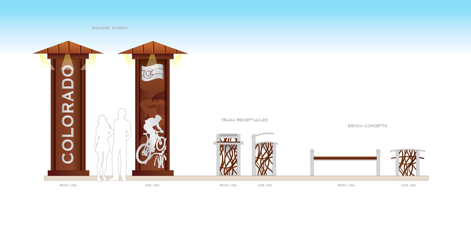 These are signage kiosk, trash receptacles and bench concepts for The Square